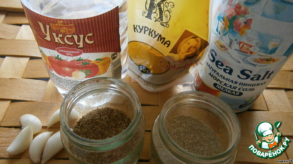 Берем следующие специи: куркума, хмели-сунели, уцхо-сунели, чеснок и уксус.