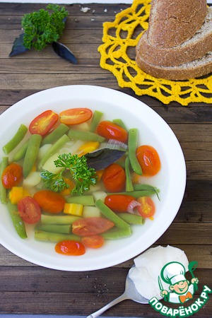 Главное условие - это свежие овощи, молодой картофель, помидоры, лук и самый важный компонент - это спаржевая фасоль, которая играет "главную скрипку" в этом супе.