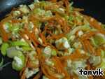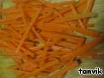 Морковь - соломкой. Обжарить овощи с 2 ст.л растительного масла 3 минуты. Слегка посолить.