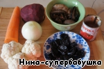 Грибы (у меня были отварены заранее) нарезать дольками, чернослив - соломкой. Капусту разделить на небольшие соцветия.