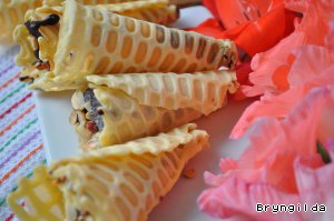 Пожарить вафли. После жарки надо свернуть вафлю в кулечек, так чтобы дырочки на тонком крае не было, или чтобы она была совсем маленькая. Свой агрегат для жарки вафель я не рискую показывать уважаемой публике, так как он очень древний, но работает исправно, и выбросить его рука не поднимается.
