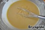 Отдельно замочим крахмал в апельсиновом соке и в подогретую массу добавим крахмал и яйцо. Постоянно помешивать венчиком. Когда смесь загустеет, снять с огня и охладить в миске с водой. Добавить сгущенное молоко, сливки и ликер.