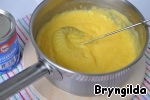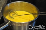 В кастрюльку выльем сок, добавим 1 ст. л сахара, лимонную цедру и мякоть апельсина, немного поварить минуты 4. Если эта масса у вас получится слишком густой, добавьте молока 50-70 мл. (это зависит от того, насколько сочные ваши апельсины).