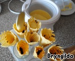 Готовую смесь поместите в холодильник на 30 минут, а потом воспользуйтесь мороженицей, а если её у вас нет, то поставьте в морозильник и через каждые 20 минут перемешивайте. После второго перемешивания разложите мороженое по рожкам.