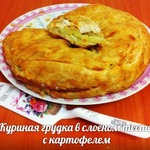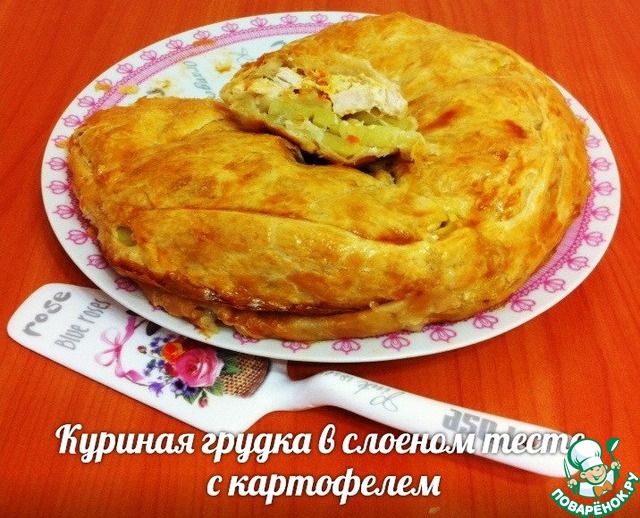 Куриная грудка в слоеном тесте с молодым картофелем и зеленым луком. Сегодня дел было достаточно и совсем не нашла времени сходить в магазин. Слоеное тесто "на всякий пожарный" лежит у меня в морозилке всегда, картошечка уже своя, родители только вчера привезли, ну и без куриной грудки мой недельный рацион не прохордит никогда. Мой любимый очень любит несладкую выпечку, решила его побаловать, а получилось, что и себя. Очень вкусный и сытный рулет, заменит и ужин, подойдет и на перекус, не меньше вкусен в холодном виде, удобно брать с собой на природу.