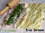 Картофель нарезать острым ножом на пластины. Я делала все постепенно и ждала пока разморозится лист теста, потому пластины поместила в воду (чтобы не пожелтели), потом просушила полотенцем.