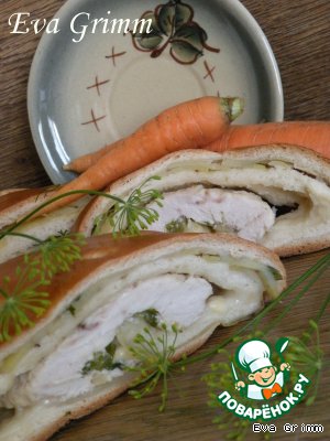 Теперь лист с начинкой свернем в рулет и защипнем края и шов, выложим рулет швом вниз, проколим в нескольких местах ножом или вилкой, дадим постоять 10 минут, смажем взбитым яйцом для красивого цвета корочки (не обязательно) и отправим в двховку на 160гр до румяности. Примерно на 40 минут.
