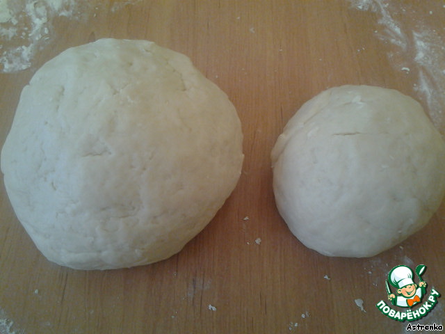 Добавляем муку, вымешиваем тесто. Делим его на 2 части: 1/3 и 2/3.