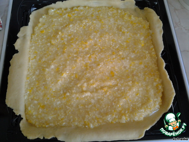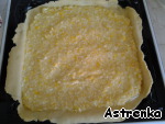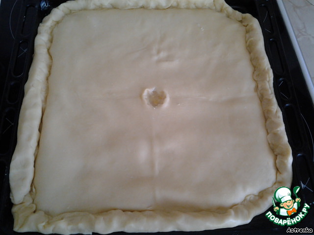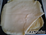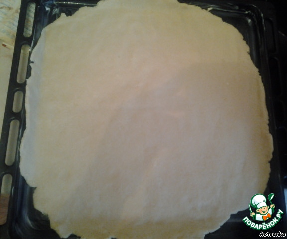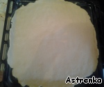 БОльшую половину раскатываем толщиной где-то 1 см и выкладываем в форму, как правило, сковороду (я брала всех ингредиентов в 2 раза больше и готовила на противне).