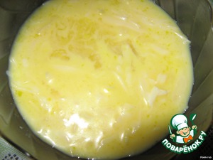 Лапша: в миску налить молоко, добавить яйца, сыр, соль и тщательно перемешать.