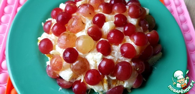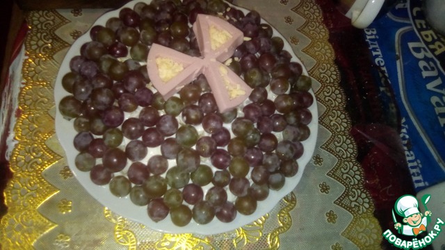 Сверху выложить виноград. Если мелкий, то целиком. Если виноград крупный, лучше нарезать половинками и вынуть косточки.