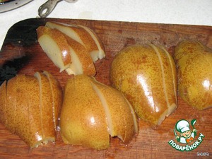 Груши помыть, обсушить и нарезать по вертикали на тоненькие пластинки.