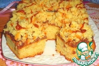 Выложить в форму тесто и вставить пластинки груши, располагая их веером по окружности.