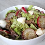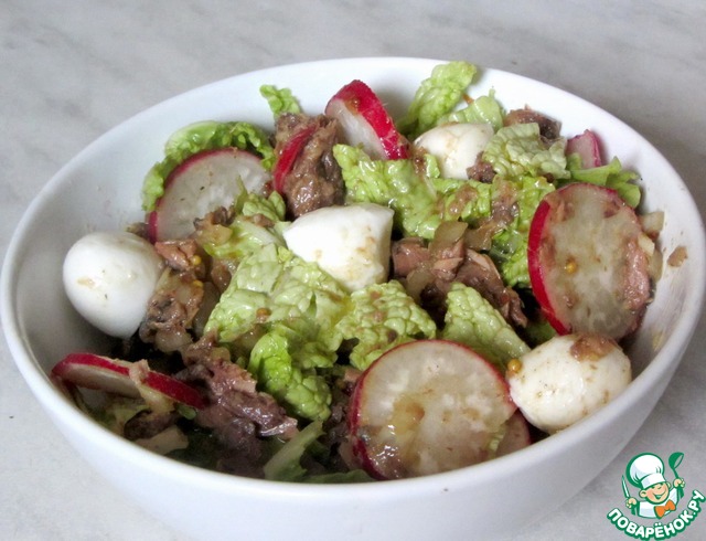 Заправка: мелко порезать кубиками небольшую луковицу. Добавить к луку красный бальзамический уксус, горчицу, щепотку сахара, соль, перец и постепенно добавлять масло, взбивая всё вместе вилкой.