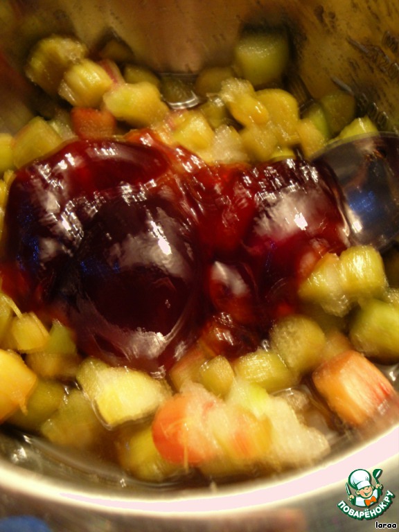 Ревень моем, чистим и нарезаем кусочками по 2-3 см. У меня был замороженный с весны, этот ход я пропустила. Перемешиваем с коричневым сахаром (скажу сразу было сладко. Поэтому если вы любите покислее, то, соответственно, убавьте дозу сахара) Укладываем на противень и запекаем в течение 20 мин.