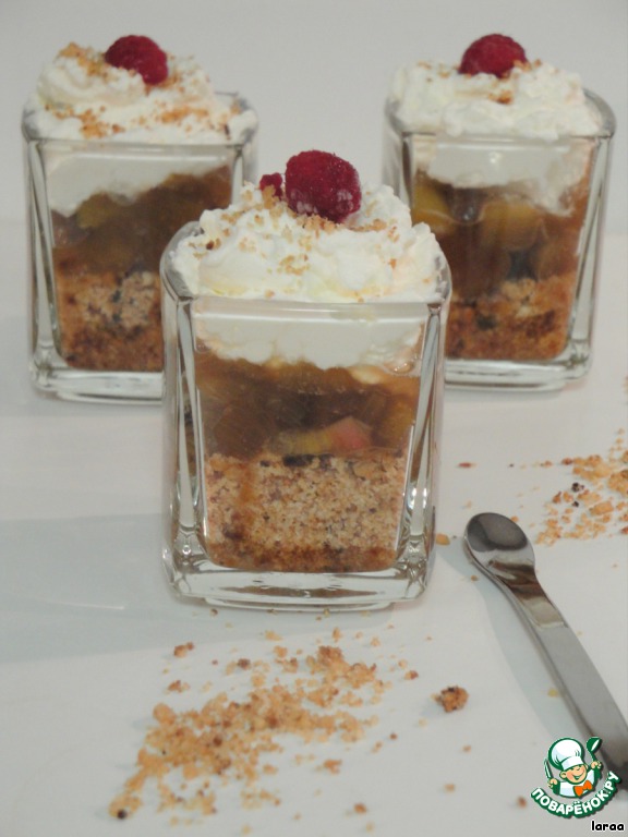Подавала я порционно, но это не обязательно. На дно положить бисквитную крошку, сверху ревень - и все это покрыть сливочной массой.