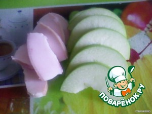 Когда мясо промаринуется, сделать 7-8 вертикальных надрезов, в которые положить по кусочку яблока и сала.