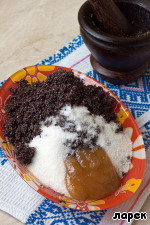 После того, как мышцы рук основательно подкачаны, к перетертому маку добавить сахар и густой, засахаренный мед или густое повидло. Я добавляла повидло из груш. Перемешать и еще раз растолочь мак в ступе. Это уже не так долго и трудоемко.