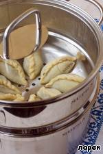 Желательно отваривать вареники сразу же, особенно если начинка получилась достаточно влажная, иначе вареники размокнут. Укладывать вареники надо на смазанную маслом решетку пароварки или бросать в кипящую воду и отваривать до готовности. Я готовила в пароварке, заодно протестировала приз, который выиграла на Поваренке этой весной.