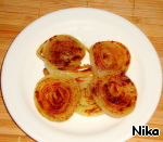 Лук также нарезала кольцами и тоже обжарила в двух сторон по 2 - 3 минуты каждую сторону.