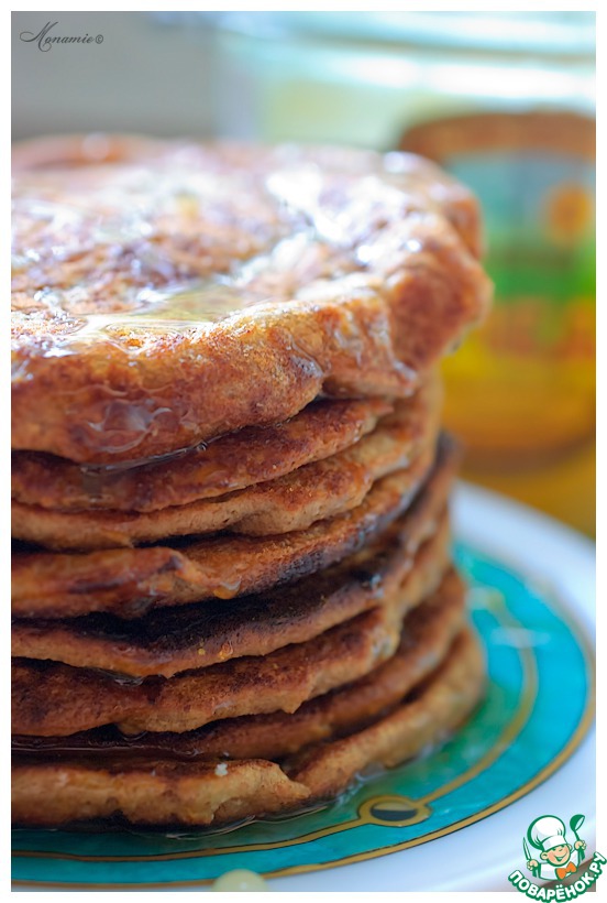 Автор предлагает отведать эти замечательные панкейки с медовым маслом (для этого необходимо взбить растопленное сливочное масло с медом) и карамелезированными грушами.