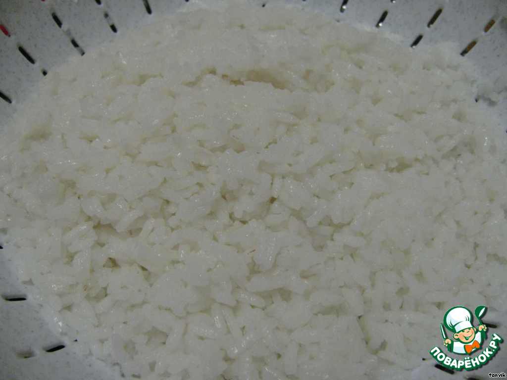 1. Рис промыть холодной водой до прозрачной воды, затем залить горячей водой, посолить и варить 20 минут на слабом огне. Затем откинуть на сито и хорошо промыть холодной водой.