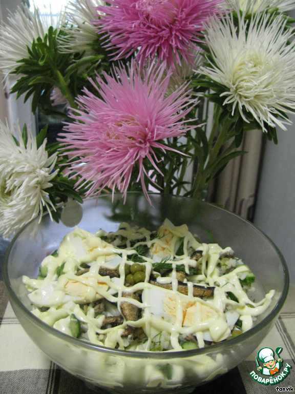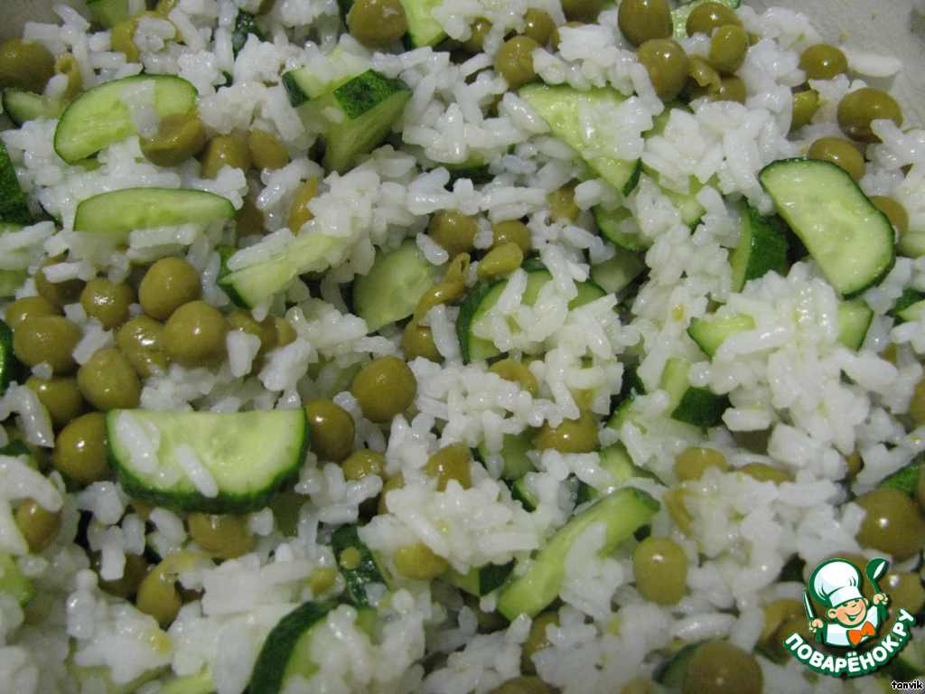 5. Смешать рис с зеленым горошком, шпротами, яйцами, рубленным укропом и огурцами.