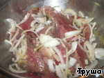 Порезанный лук надо посыпать солью и сахаром, а затем отжать руками, чтобы он выпустил сок.