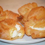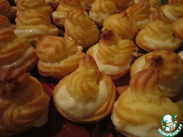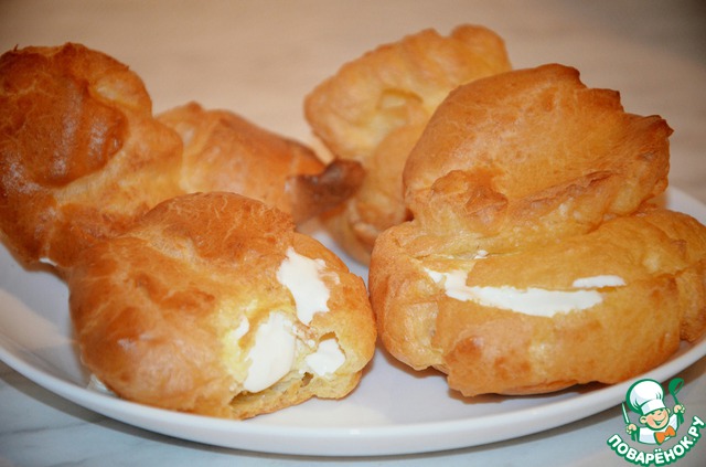 Влить в кастрюлю полстакана воды и полстакана молока, добавить масло, соль, сахар и поставить на огонь. Как только вода закипит, всыпать сразу всю муку, размешать и на слабом огне проварить 1-2 минуты, помешивая. Затем снять кастрюлю с огня и прибавлять яйца (по одному), тщательно размешивая; как только тесто начнет тянуться, прекратить прибавление яиц, тесто разделать в виде булочек, выкладывая их на лист, слегка смазанный маслом, на расстоянии 2-4 см одна от другой. Для выпечки поставить лист в жаркий духовой шкаф разогретый на 220*С на 10 минут, а как только булочки зарумянятся и увеличатся в объеме, убавить жар в шкафу до 190*С, не вынимая булочек, и допечь до готовности 15-20 мин. Готовые булочки надрезать вдоль с одной стороны, и, приоткрыв, наполнить середину кремом. Для крема взбиваем сливки, добавляем сахарную пудру и растертый творог.