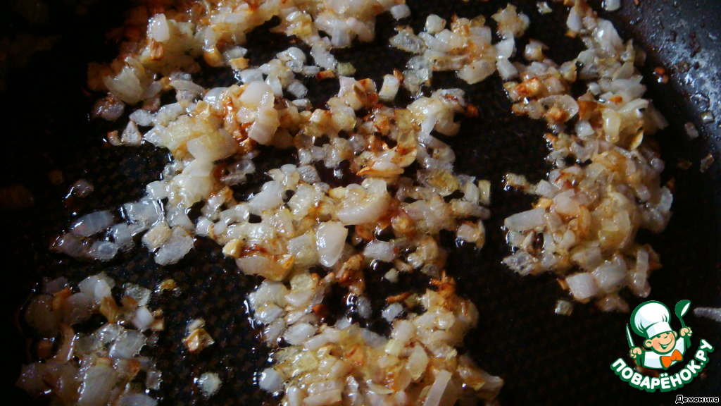 Лук и чеснок мелко порезать и подрумянить до золотистого цвета на растительном масле.