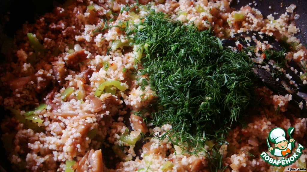 Добавить кускус и обжаривать вместе ещё 2-3 минуты.