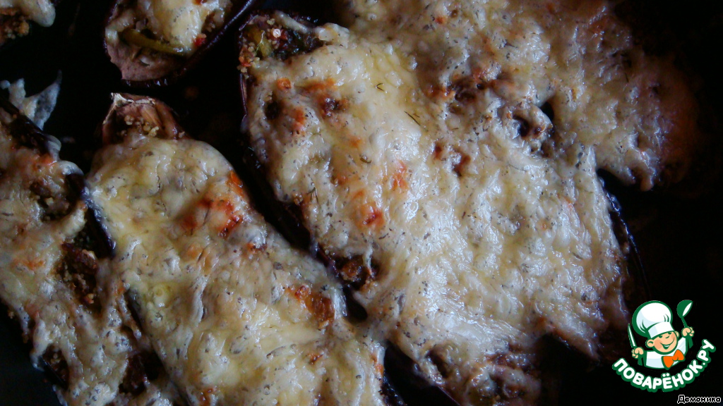 Половинки баклажанов наполнить начинкой и уложить на смазанный маслом противень.