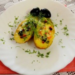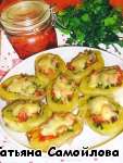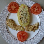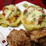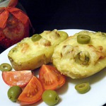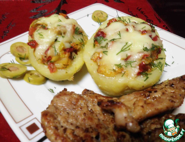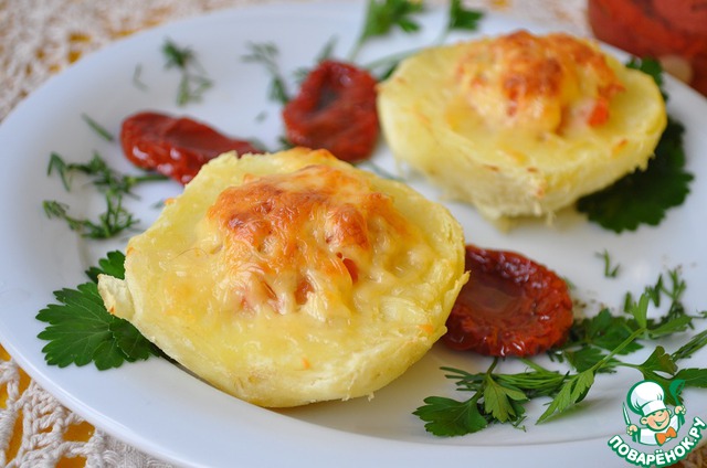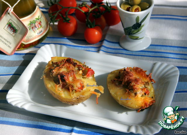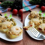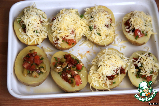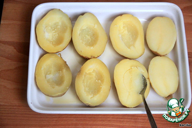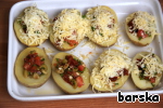 [+5]Картошечка у меня была маленькая, поэтому не стала вырезать серединку, а выложила начинку прямо на половинки. Получилось как-то все хаотично разбросано, но на вкус не повлияло!