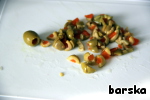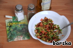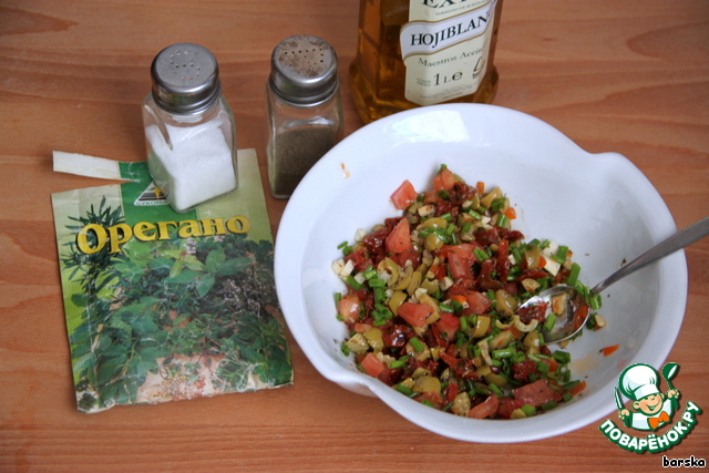 Измельчённые томаты, оливки, лук, чеснок смешать в одной миске, добавить оливковое масло, соль, перец, орегано.