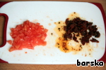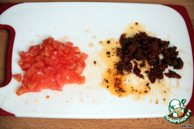 Нарезать мелко твёрдую часть помидора и вяленые томаты.