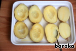 Картофель помыть, отварить в мундире 20-25 минут. Охладить. Разрезать вдоль напополам.