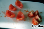 Помидор надрезать крестообразно, бланшировать в кипятке, а потом в холодной воде, снять кожуру, нарезать дольками. Вынуть мякоть.