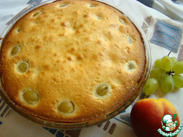 Сверху виноград. И снова отправить в духовку , уменьшив при этом температуру до 180 градусов, выпекать 25-30 минут.