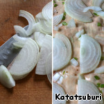 Лук - полукольцами или как нравится. Идеально подходит белый - он сочный и не такой ядреный, но у меня не оказалось его в нужный момент, взяла обычную молодую "репку".