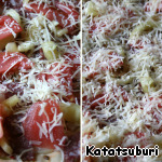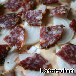 Колбаска и ветчинка. Вообще, мясная часть - на Ваш вкус, тут нет предела экспериментам. Как-то я делала даже пиццу с печеночным паштетом...