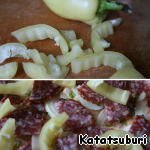 Острый перчик пепперони на самом деле есть недозрелый чили, поэтому и вери-вери хот. Резать в перчатках. Детям не давать. А взрослым - очень даже: поднимает настроение, улучшает пищеварение. Мелко режем, равномерно распределяем по поверхности