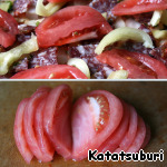 Помидоры... самые спелые, летние! Предварительно их нужно ошпарить кипятком, опустить для "шока" в очень холодную воду и снять кожицу. Порезать тонкими ломтиками и разложить по поверхности.