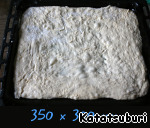 Ком слегка присыпаю мукой, и влажными руками формирую равномерную по высоте лепешку на весь противень.