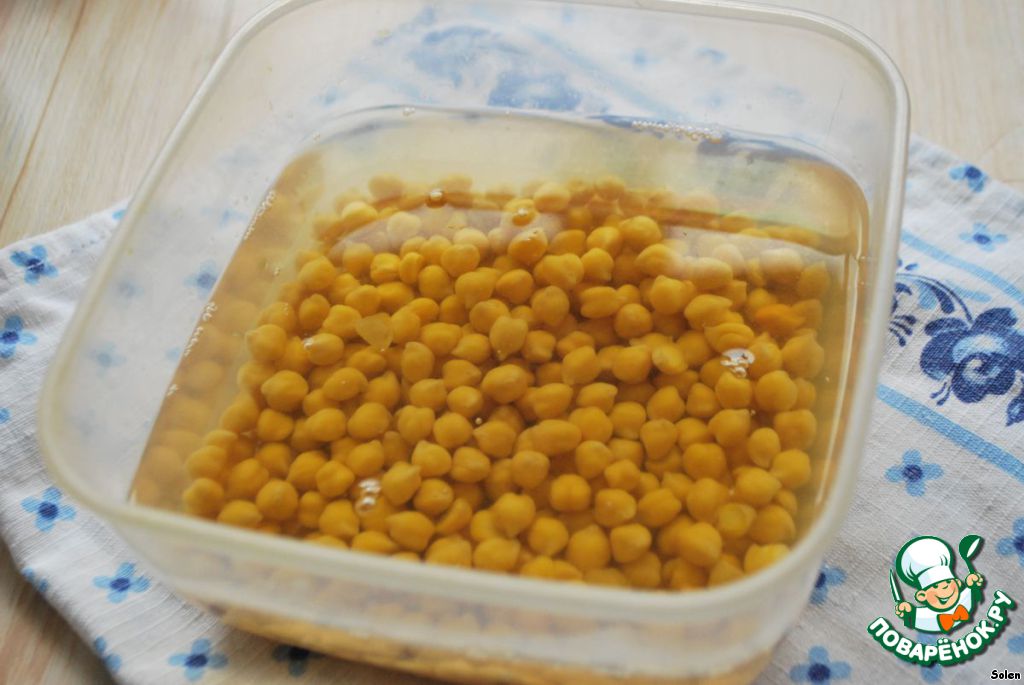 Если используете сухой нут, то его необходимо накануне вечером замочить в воде (я обычно заливаю кипятком, можно добавить щепотку соды).