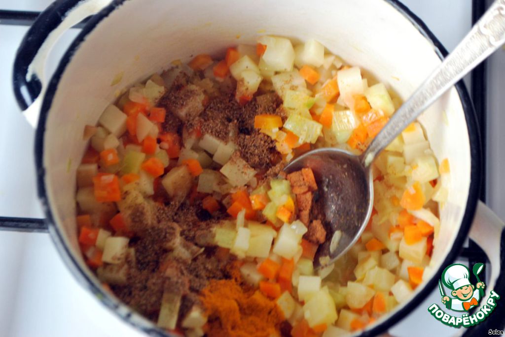 В большой кастрюле разогреть 3 ст.л. оливкового масла. Выложит овощи: лук, морковь, пастернак, картофель, фенхель, чеснок и имбирь. Влить 0,5 стакана воды. Тушить около10 минут, затем добавить специи. Тушить, помешивая, еще 10 минут.