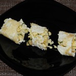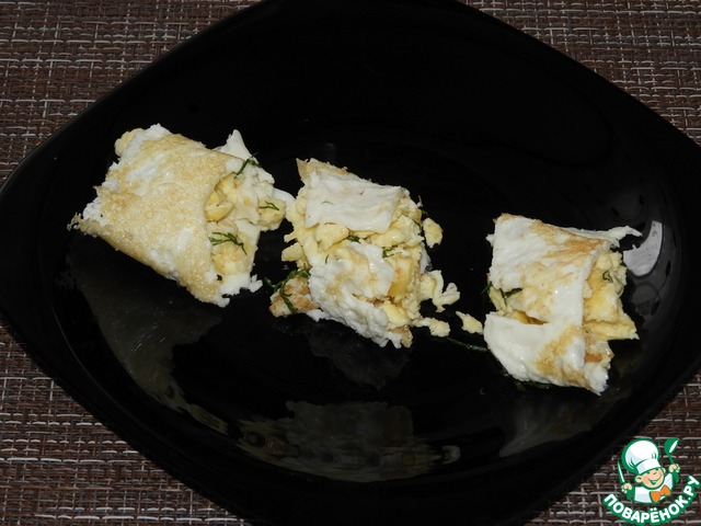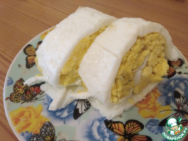 Белковый блин и желтковую начинку нужно готовить одновременно, тогда времени уйдет немного и омлет будет горячим и вкусным. Достаем готовый белок.