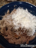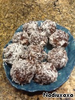 Вынимаем ореховую массу из холодильника. Если она все еще сильно липнет, добавляем кокосовую стружку. Кстати, еще можно добавить немного коньяка или рома для аромата.