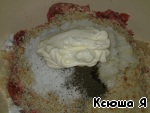 Добавить к фаршу 2 ст. л. майонеза, 0.5 ст. л. соли и чёрный молотый перец.
