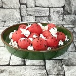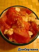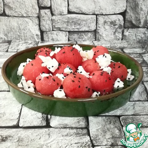 Укладываем в порционную посуду поочередно арбуз и брынзу, в несколько слоев (чтобы не перемешивать и не помять брынзу). Посыпаем кунжутом. Заправка не нужна - и так будет очень вкусно :)