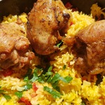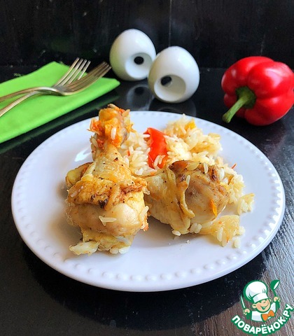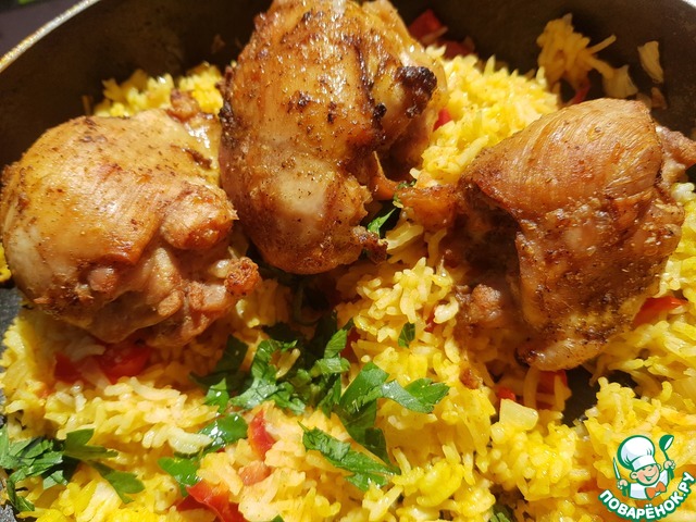 Вынуть окорочка из формы, выложить в неe рис, лук, перец, зелень, влить бульон. Довести до кипения, посолить, поперчить. Выложить сверху окорочка и 30 минут запекать в духовке.